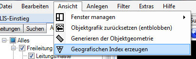 Der geografische Index ist ein datenbanktechnisches Hilfsmittel zur Darstellung der Objekte in der grafischen Ansicht. Es kann vorkommen, dass die Ladezeiten beim Berechnen des anzuzeigenden Inhalts sehr lange dauern. In diesem Fall kann das Erzeugen des geografischen Index die Performance erhöhen.